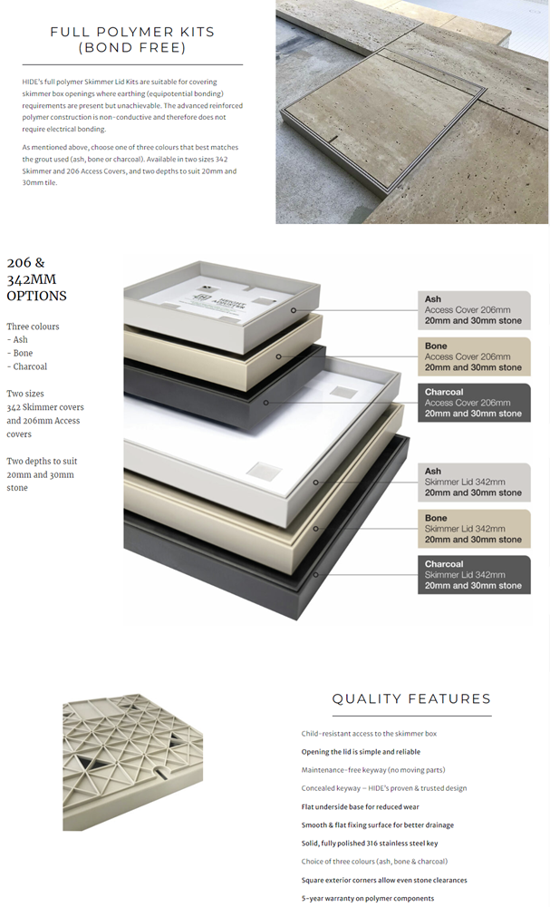 The Hide Skimmer Lid Kit is a strong polymer lid that measures 306mm x 306mm. It fits pool skimmers with inserts that range from 25mm to 32mm thick. Its clean, modern style blends well with any pool area. You can choose from three colors: Ash, Bone, and Charcoal. Each option helps match your pool design.