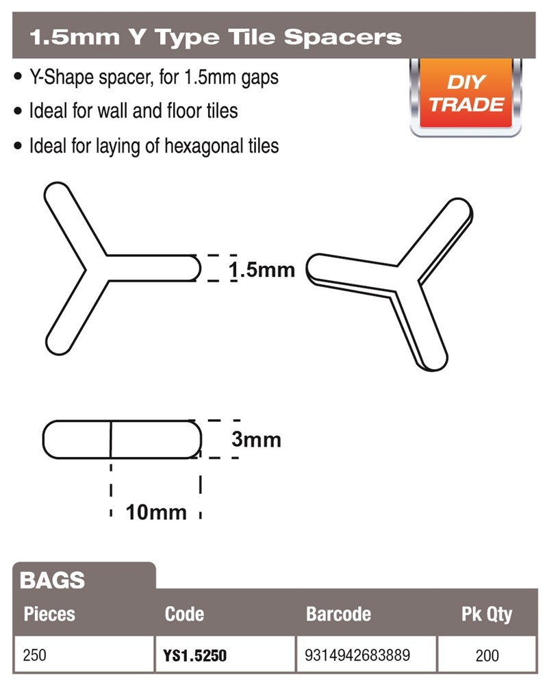 250 Pack. Y Shape Spacers for 1.5mm gaps. Ideal for walls or floors. Suitable for laying of hexagon tiles.